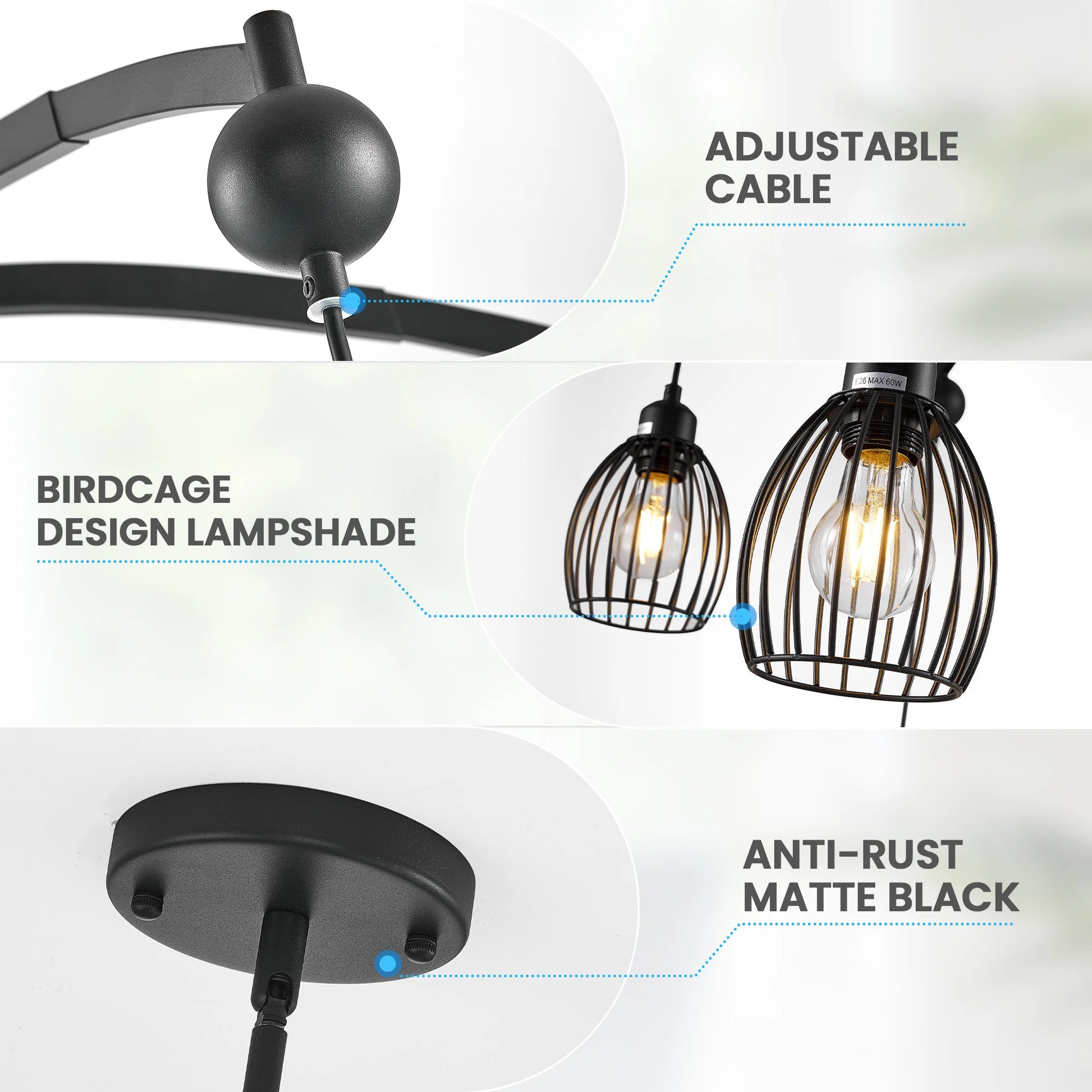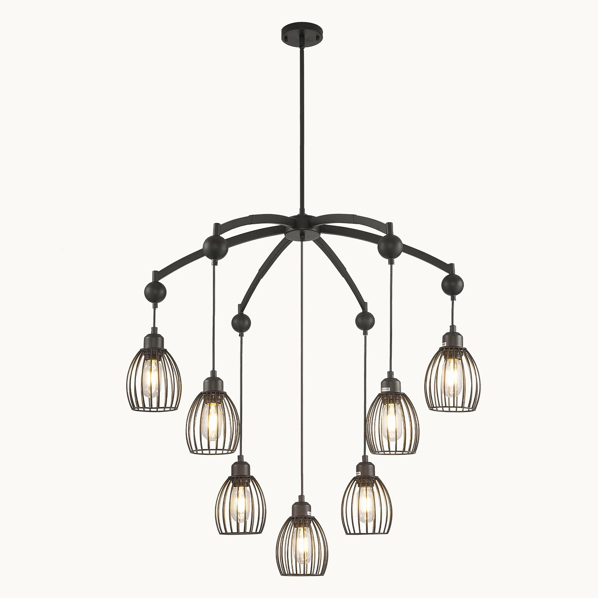This modern chandelier has a extension hanging black rope which gives maximum flexibility in hanging heights according to your need. The height of each metal cage can also be adjusted according to the shape you want.