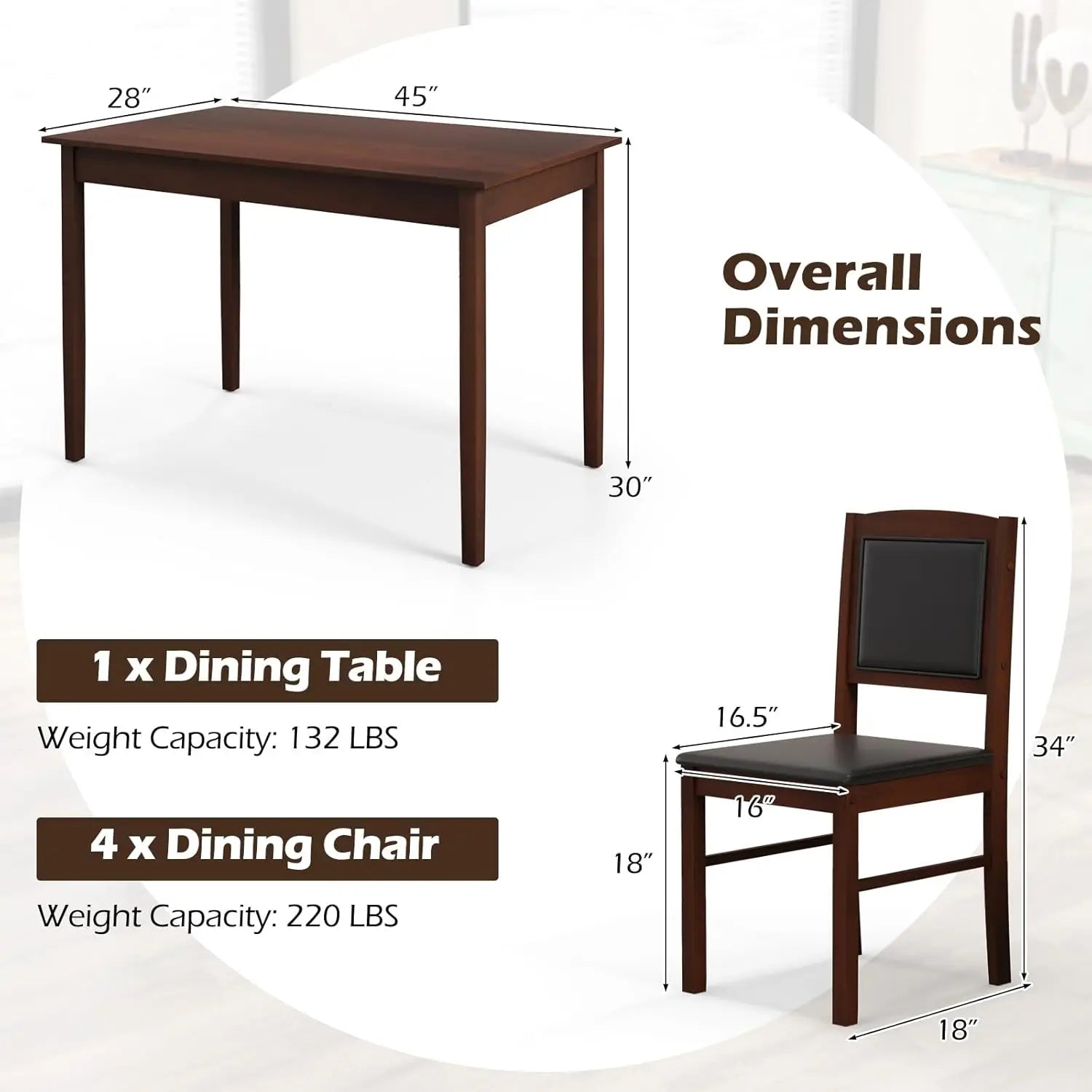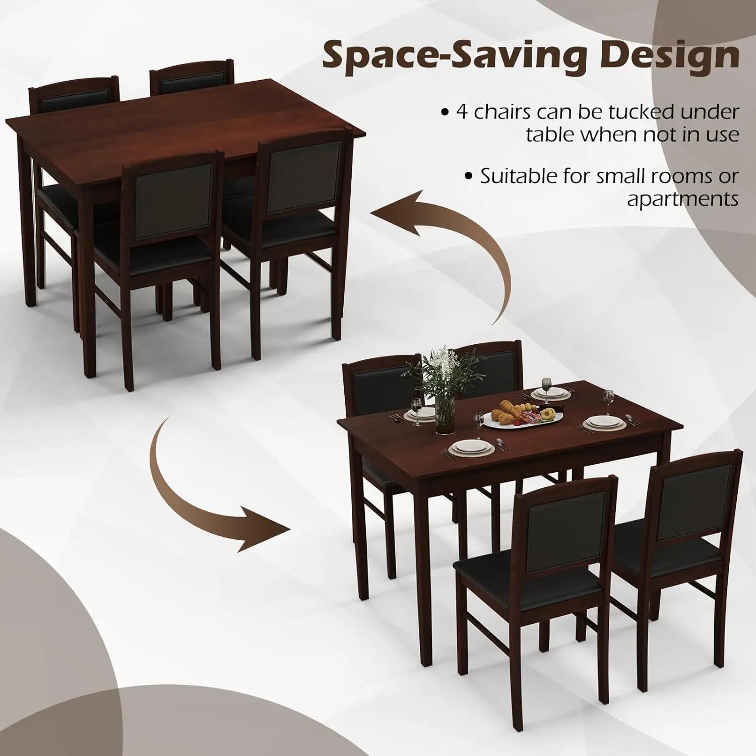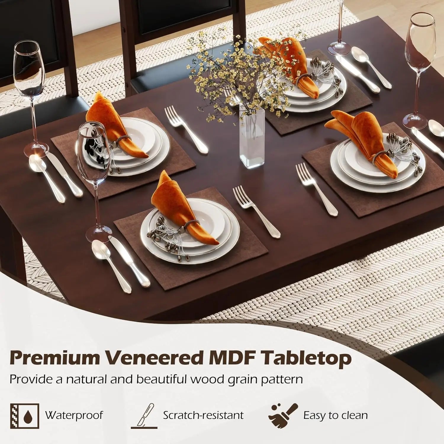 【Timeless Elegance for Any Space】This 5-piece dining set features a solid wood rectangular table and 4 chairs, designed to bring a classic and sophisticated touch to your kitchen, dining room, or restaurant decor.