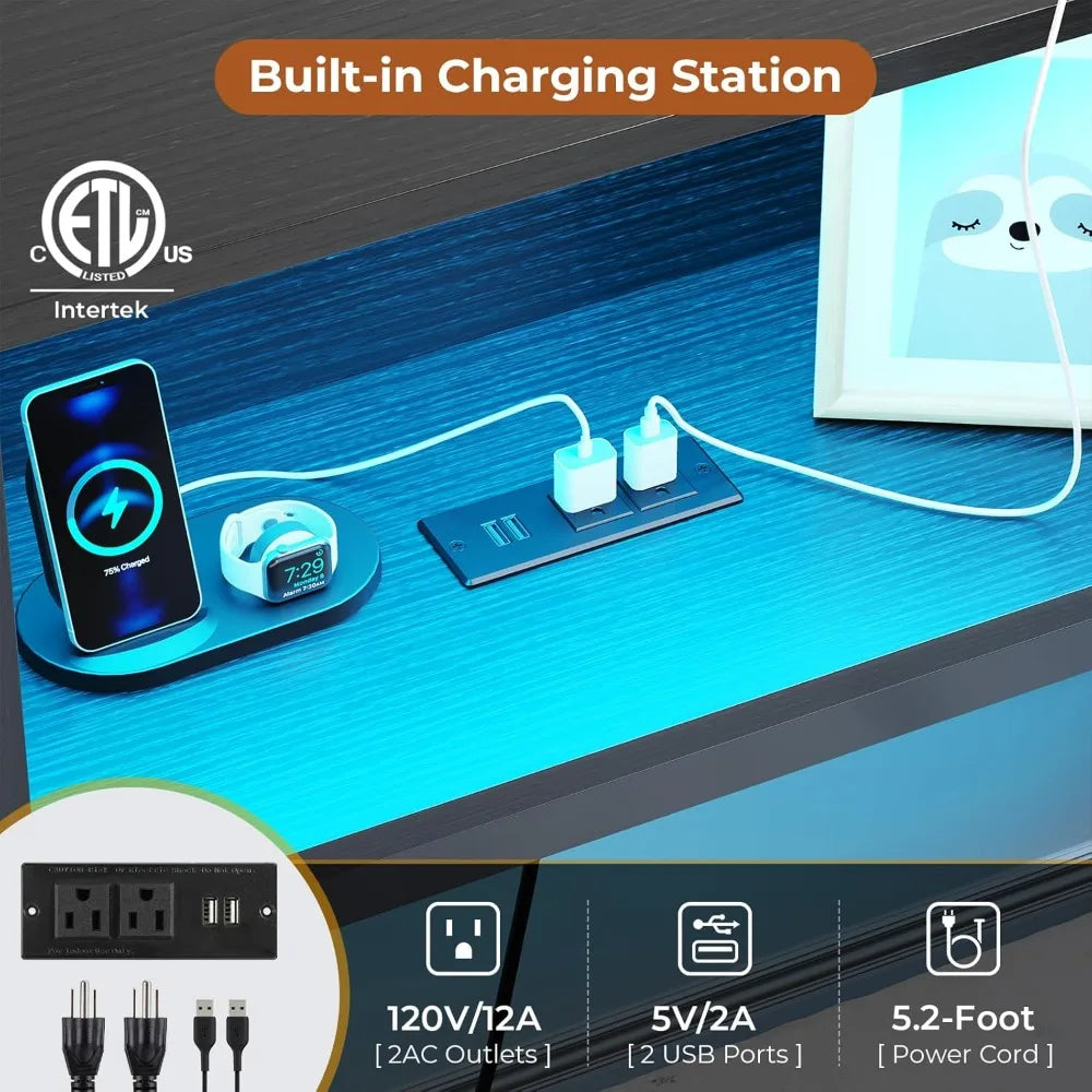 Full Corner Bed Frame with LED Lights, Storage Drawers & Charging Station - No Box Spring Needed.